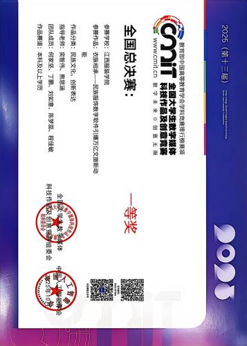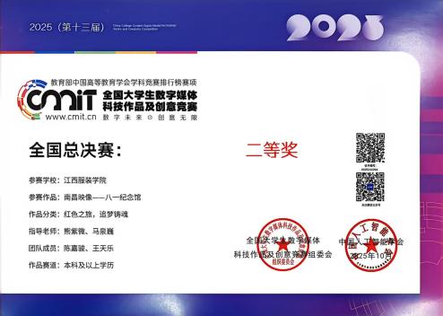 (艺术设计学院 奕智伟撰稿)2025 年(第十三届)全国大学生数字媒体科技作品及创意竞赛全国现场总决赛圆满落幕。作为教育部中国高等教育学会学科竞赛排行榜赛项,由中国人工智能学会联合组委会主办的国家级高水平赛事,本届竞赛以 “科技创领未来,创意变革时代” 为宗旨,聚焦智能科技与创意设计融合,设置多类核心赛道,吸引全国数十万师生参与、千余组优秀团队晋级总决赛。我校艺术设计学院表现亮眼,凭借优质作品斩获佳绩:在“民族文化,创新表达” 赛道荣获国赛一等奖,在 “元宇宙及科幻数字作品”“红色之旅,追梦铸魂”“AIGC 数字创意作品创作”三大赛道均斩获国赛二等奖。