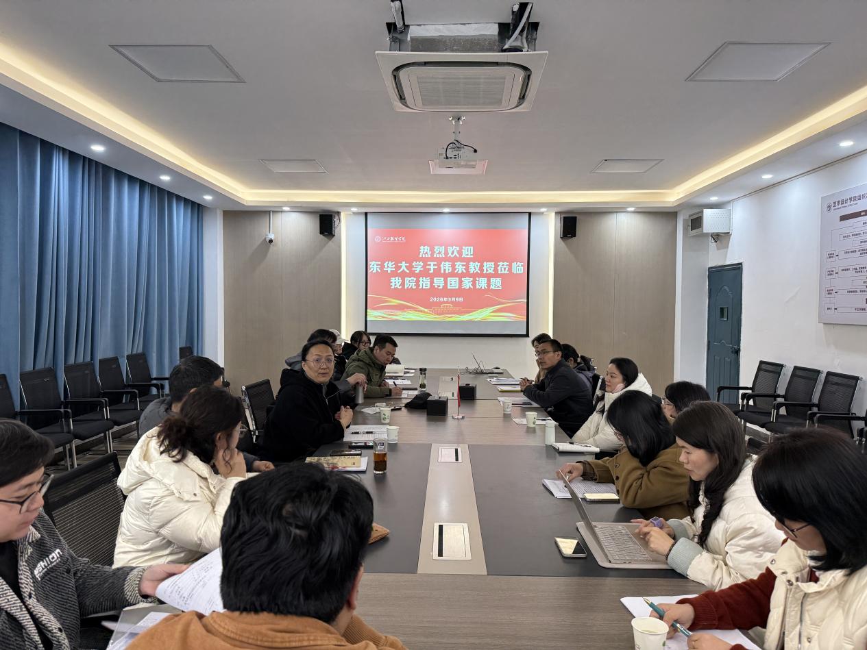 【艺术设计学院讯】为进一步提升国家课题申报质量,破解科研申报中的共性难题,助力学校科研工作提质增效,2026年3月9日下午1:30,在艺术楼205会议室召开国家课题指导会,特邀东华大学于伟东教授莅临指导。艺术设计学院院长刘琳、副院长卢振邦,学院博士、教授、副教授及商学院、时尚传媒学院、军体部骨干教师等参会,会议由卢振邦主持。