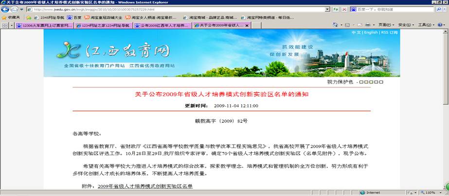 来自省教育厅最新消息,根据省教育厅、省财政厅《江西省高等学校教学质量与教学改革工程实施意见》,我省高校开展了2009年省级精品课程和省级人才培养模式创新实验区的评选工作。以杨汉东副校长为负责人的“服装高技能应用型人才培养模式创新实验区”此次也获省厅批准,这不仅是对我校办学思路,办学方向的肯定,更是对我校“校企合作办学模式,工学结合育人模式,教学做为一体情境式教学模式”三大育人模式做法的肯定。我校也将秉承特色化办学之路,秉承高职教育办学理念,更好的推进我校的人才培养水平。