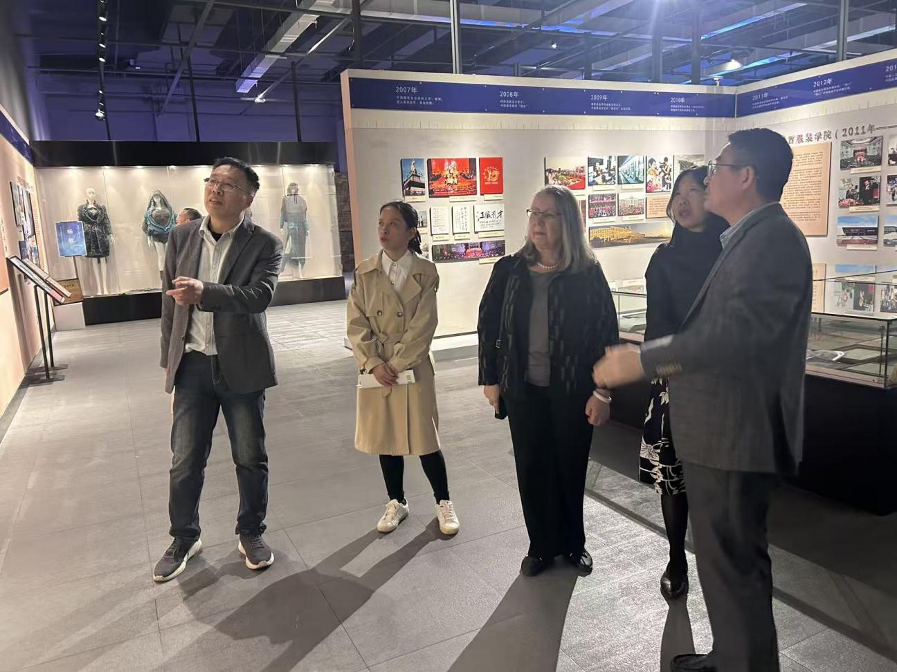 下午2:30Nataliya Chzhen教授首先走进江西服装学院服饰博物馆,开启了一场深度的文化服饰探索之旅。参观过程中,孙承飞馆长向Nataliya Chzhen教授详细介绍了博物馆的核心展区,从承载千年礼制的中国古代服饰、彰显民族特色的少数民族服饰,到工艺精湛的清代经典服饰,每一件藏品都让教授驻足细赏。Nataliya Chzhen教授表现出浓厚兴趣,不时就纹样的图案设计、制作工艺、文化内涵等方面与馆长深入交流,对中华服饰文化的深厚底蕴与独特魅力连连赞叹。