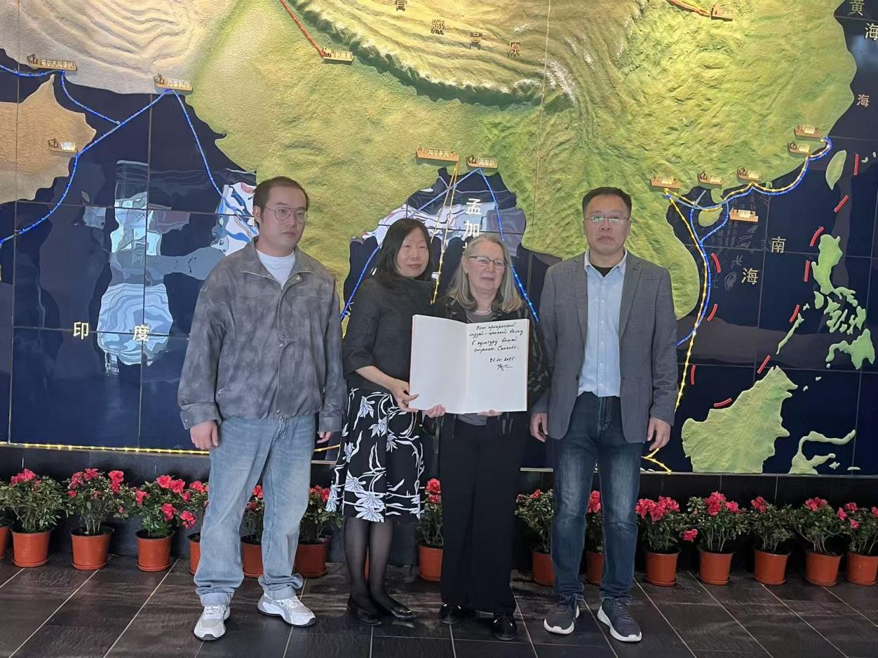 捐书仪式结束后,在相关负责人的带领下,教授参观了校史馆。从1991年建校初期的艰辛创业,到2025年三十余载的蓬勃发展,校史馆内一幅幅珍贵的照片、一段段详实的文字,生动展现了江西服装学院的成长历程与办学成就。参观尾声,Nataliya Chzhen教授在留言簿上欣然提笔,写下“贵校办学成果卓越,此次交流之旅令人难忘,衷心祝愿江西服装学院未来发展再攀新高”的美好寄语,为本次校史馆参观画上圆满句号。