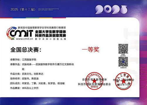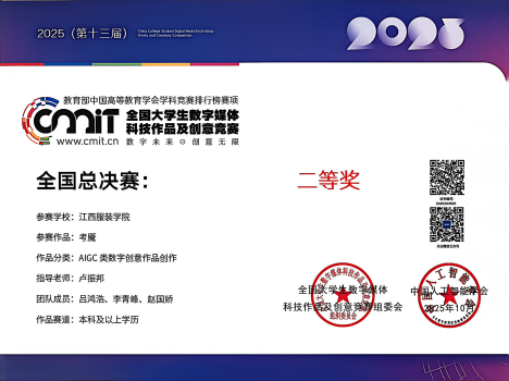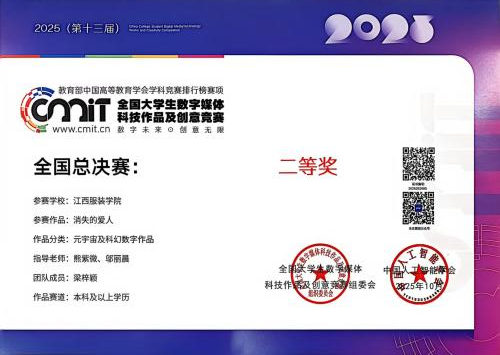 2025年(第十三届)全国大学生数字媒体科技作品及创意竞赛全国现场总决赛圆满落幕。作为教育部中国高等教育学会学科竞赛排行榜认定的国家级高水平赛事,本届大赛由中国人工智能学会联合主办,以“科技创领未来,创意变革时代”为主题,聚焦智能科技与创意设计深度融合,吸引了全国数百所高校、数十万名师生参与,千余支优秀团队晋级全国总决赛。我校学子表现优异,斩获1项一等奖和3项二等奖,其中在“民族文化,创新表达”赛道荣获全国一等奖,在“元宇宙及科幻数字作品”“红色之旅,追梦铸魂”和“AIGC数字创意作品创作”三个赛道均获二等奖,充分展现了扎实的专业能力与创新水平。
