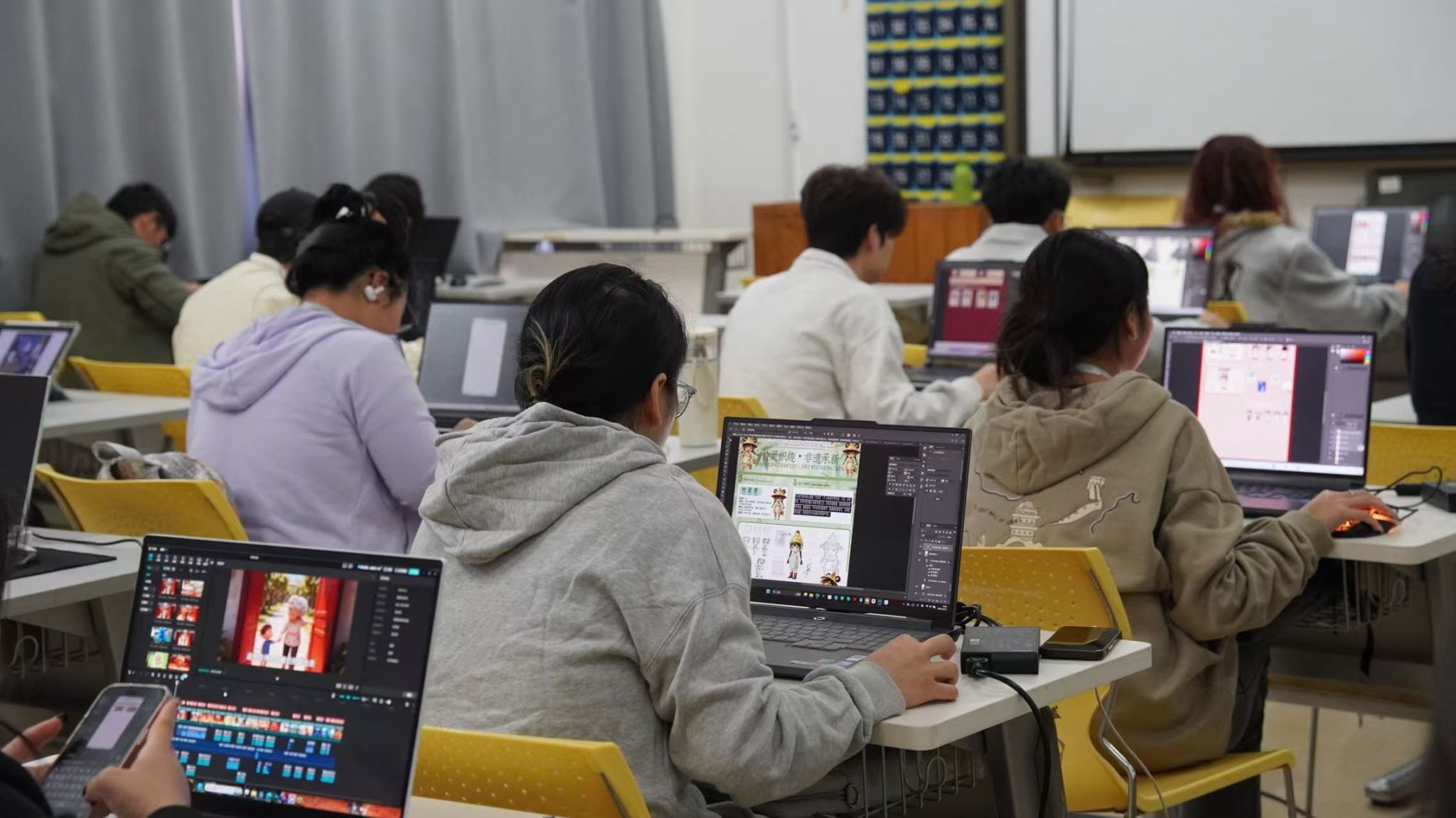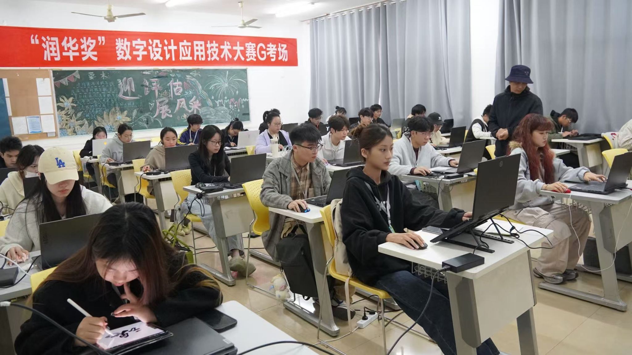 此次活动共268名选手参赛,设置美术学、视觉传达、数字媒体与环境艺术四个赛道,全面考察选手的综合设计能力。比赛于上午9时正式拉开帷幕,各个赛场迅速进入紧张而有序的创作状态。选手们全神贯注在电脑前,运用人工智能工具探索创意的无限可能,或在画板与专业软件中将数字灵感转化为具体的艺术作品,现场充满了浓厚的艺术创作氛围。