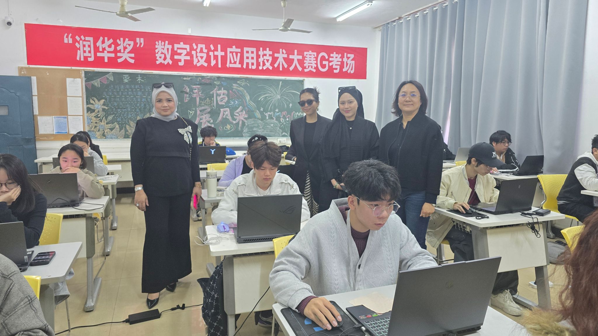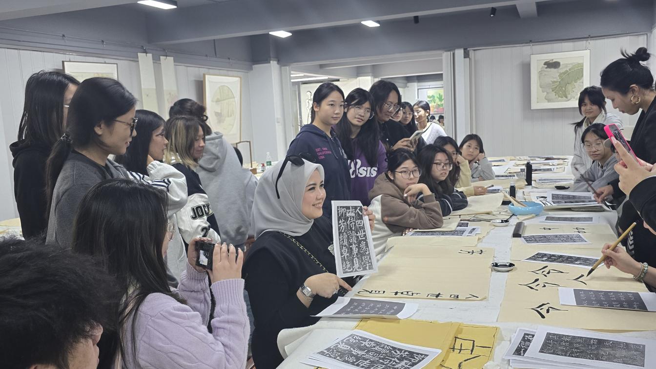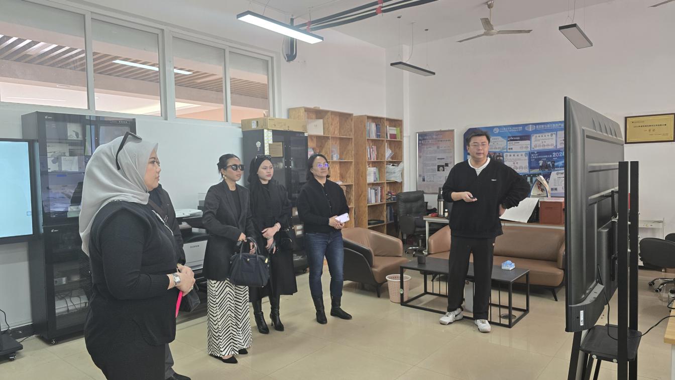 来自马来西亚城市大学SITI FAIRUSZ.AINUDDIN SHAH院长一行莅临我院进行友好访问与竞赛交流。在我院领导班子的陪同下,代表团一行深入学生竞赛现场,实地观摩了各赛道选手的精彩创作过程。同时参观了学院各专业工作室,在油画工作室,他们仔细观看了学生们充满表现力的作品,并了解不同绘画技法和材料的应用。数字媒体艺术工作室更是展示了学院在融合前沿技术与艺术创作方面的实力,从虚拟现实到数字动画,学生们展现了前沿的数字艺术成果。在陶艺工作室,被精湛的工艺和富有创意的作品深深吸引,详细了解了陶土的塑形、烧制等过程,对学生们将传统技艺与现代设计相结合的能力表示赞赏。在国画工作室,院长一行对中国传统水墨画的独特韵味和意境表达表示赞赏,并对学生们传承和创新国画技艺的努力给予了肯定。令人惊喜的是,院长一行还在现场挥毫泼墨,亲笔书写了令人印象深刻的作品,将现场气氛推向高潮,更成为了一次珍贵的文化交流瞬间。