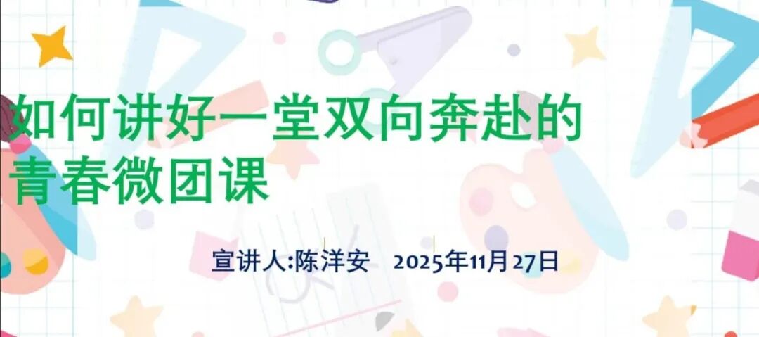 课上,陈洋安老师以“双向奔赴”为核心,从内容设计、表达技巧、情感共鸣三大维度展开分享。他结合实践案例拆解“微而不浅、团味浓厚、课型鲜明”的创作逻辑,强调微团课需紧扣青年需求,将理论与青春故事相融。针对艺术设计专业特点,老师提出“以美育人、以文化人”思路,鼓励学员融入专业特长,通过视觉呈现与创意表达增强课堂吸引力。
