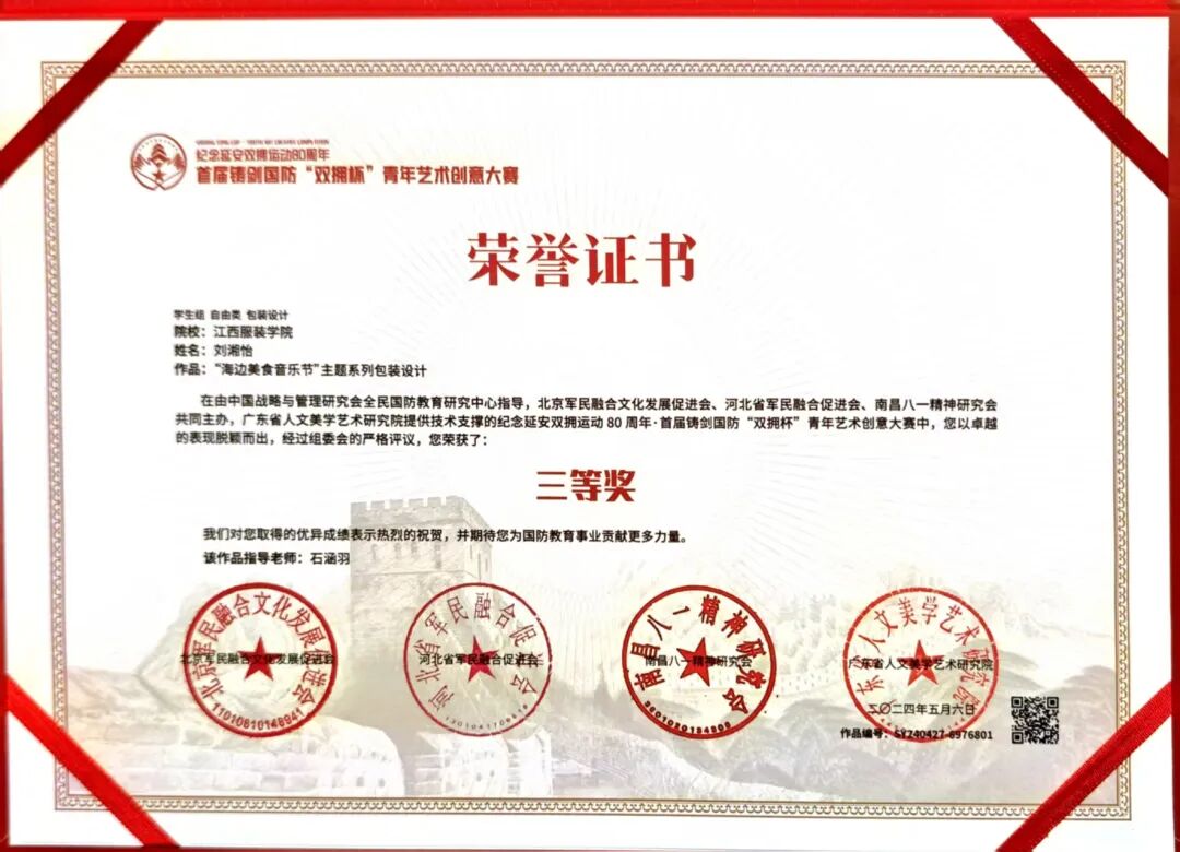 2024年,荣获首届铸剑国防“双拥杯”艺术青年创意大赛“三等奖”;