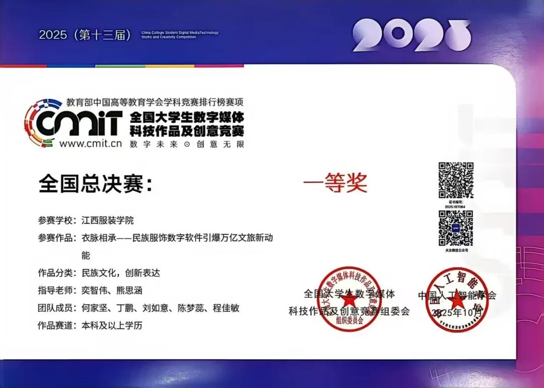 2025年,荣获“全国大学生数字媒体科技作品及创意竞赛”国赛一等奖
