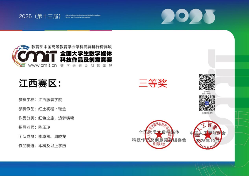2024年,荣获“第十三届全国大学生数字媒体科技作品及创意竞赛”省级三等奖