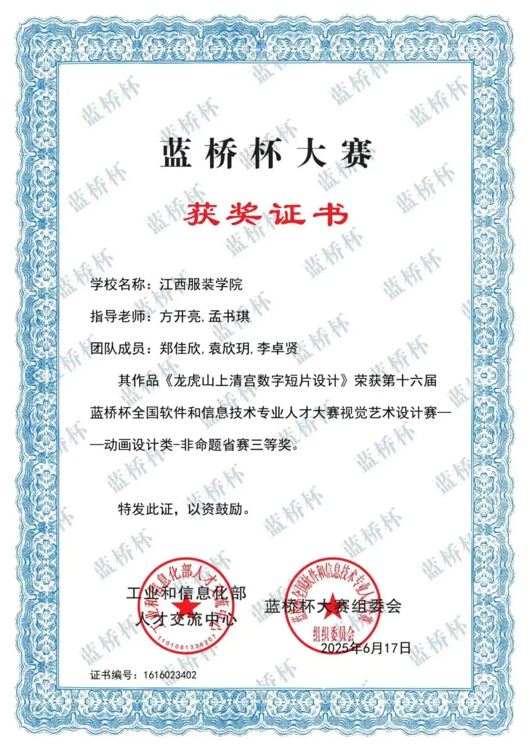 2025 年,荣获“第十六届蓝桥杯全国软件和信息技术专业人才大赛视觉艺术设计赛”省级三等奖