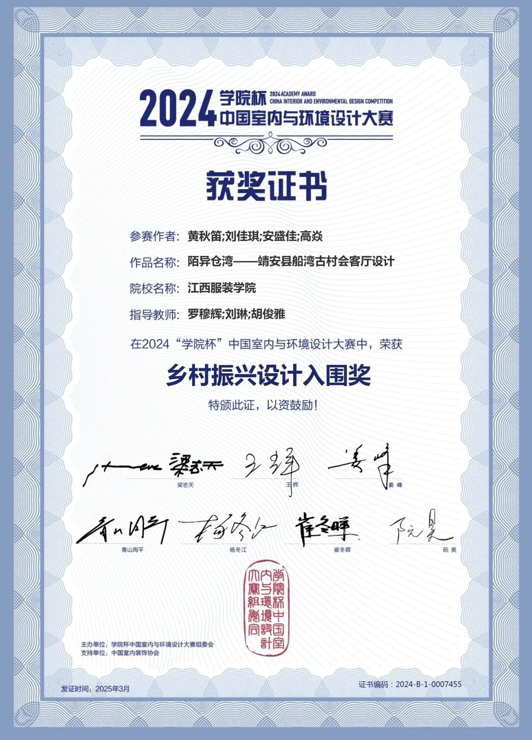 2024年,荣获第十届“中装杯“全国大学生环境设计大赛二等奖