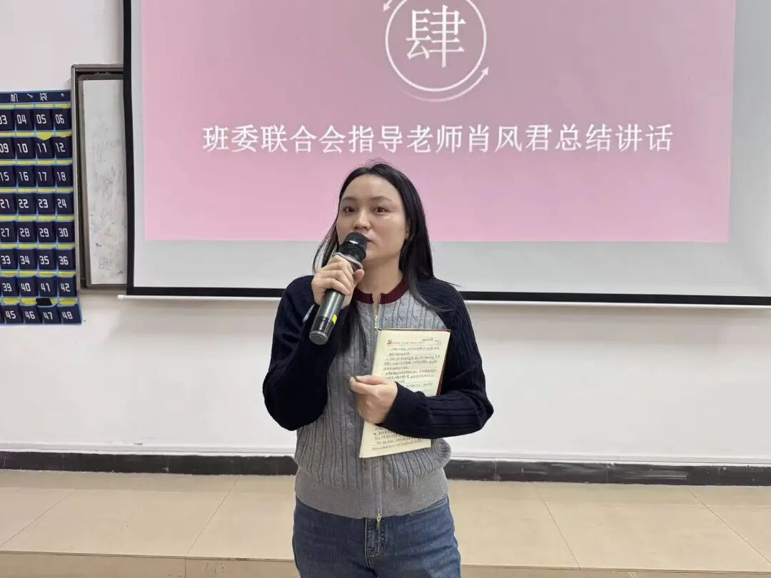 最后,班委联合会指导老师肖风君作总结讲话。她回顾了班联的发展历程,高度肯定了班联在各项工作中取得的突出成效。同时向全体成员的辛勤付出致以诚挚谢意,并从沟通交流、细节规范、责任传承等维度提出殷切期望:希望新成员快速融入集体,各部门强化协作联动;全体成员要勇于担当、精进学习,始终坚守加入班联的初心与热忱,在服务同学的实践中实现自我成长。