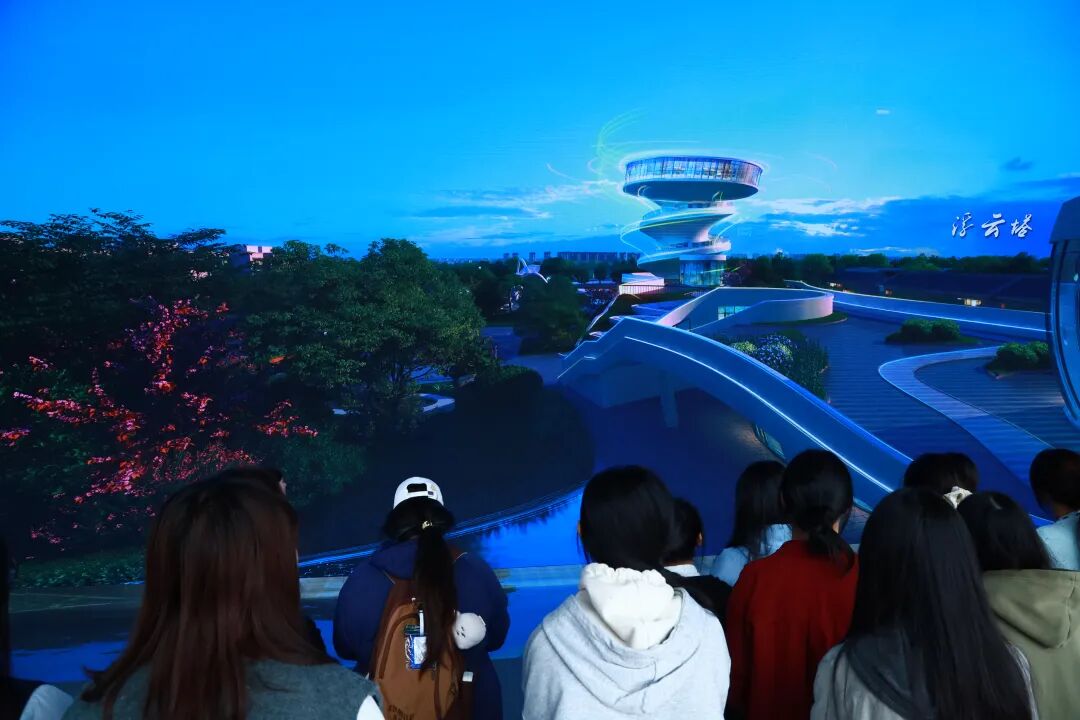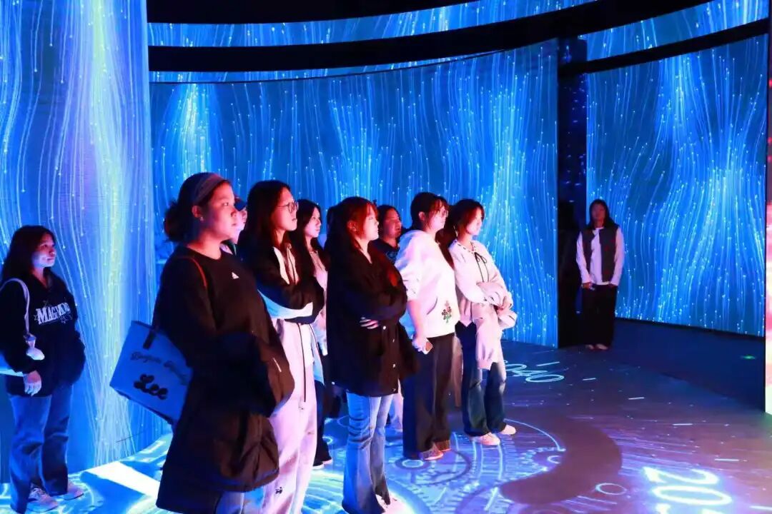 南昌市规划展示中心以“自然——历史——现在——未来”为脉络,用科技为笔勾勒城市的过去与未来,成为学子们感知空间美学的生动课堂。一踏入序厅,近330平方米的巨浪弧形屏便带来强烈视觉冲击,江豚嬉戏的互动特效、鄱阳湖的生态盛景与南昌千年变迁画面交织,让学子们直观感受“一江十河串百湖”的城市生态肌理。