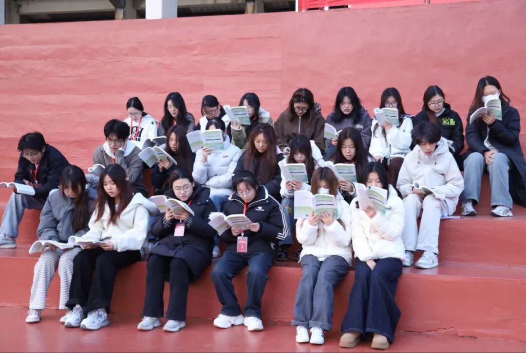 晨跑后,学员们围坐在田径场的台阶上。手里捧着思政书籍,清朗的读书声顺着晨风传开。大家看着书中的理论字句,眼神中充满了热忱。