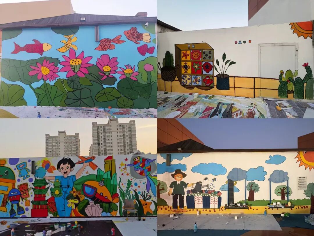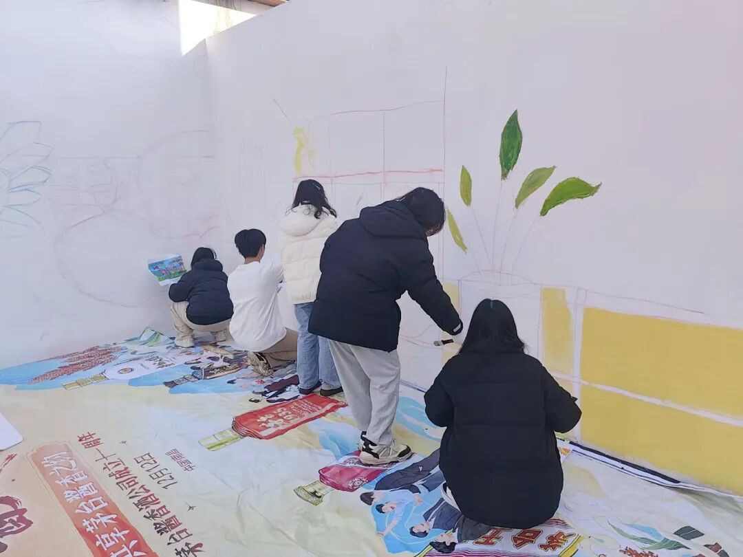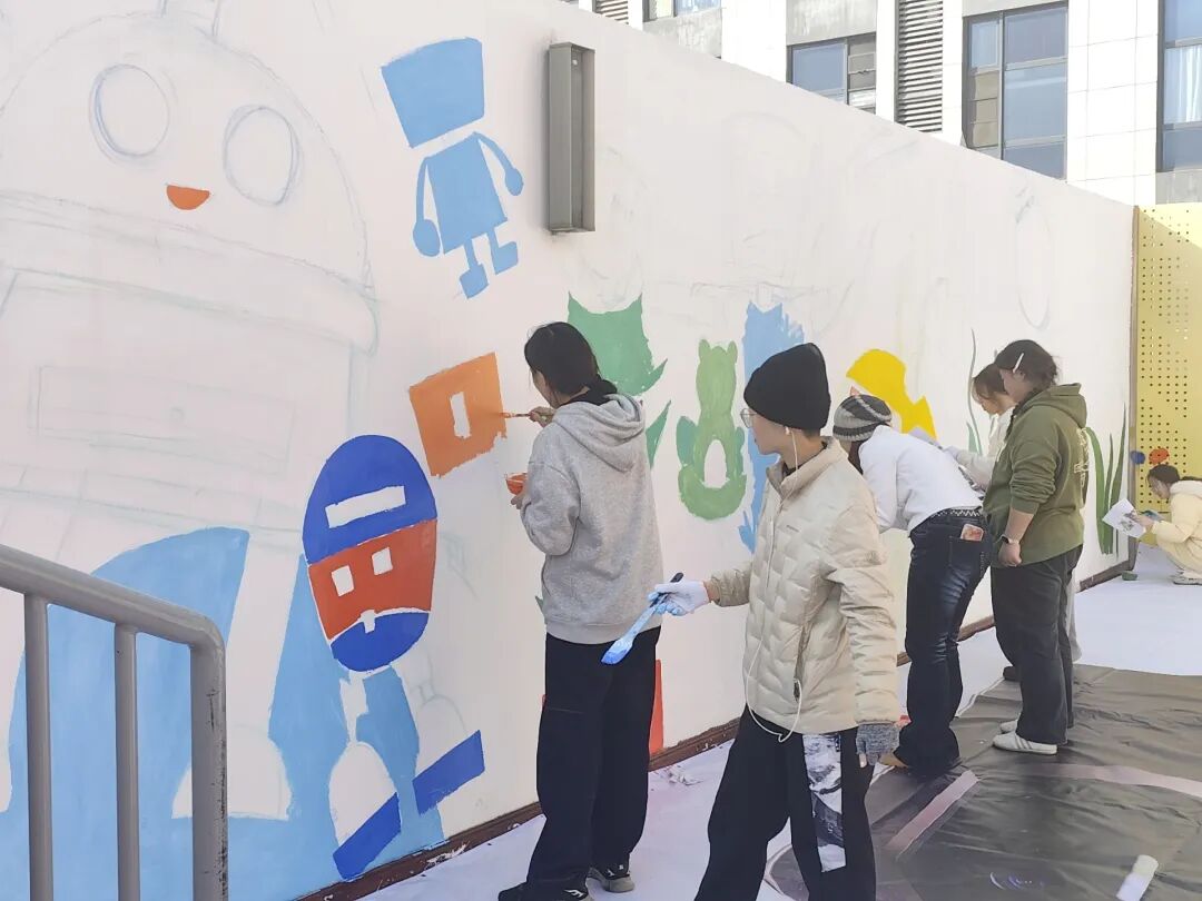 接着,志愿者们充分发挥专业特长,以孩童视角作为切入点,将自然景观与创意设计巧妙融合,在墙面上绘出童趣盎然、积极向上的主题图案。创作中,大家相互协作,针对图案细节、色彩搭配等方面反复研讨打磨;面对墙面不平整、颜料晕染等难题,也凭专业技巧一一化解,全程专注热忱。