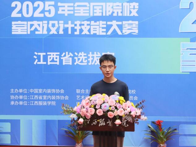 江西服装学院环境设计专业王鑫同学代表全体参赛选手发言,向主办方、指导老师及工作人员致谢,并分享了备赛过程中的创意探索与实践收获。他表示,大赛是理论与实践结合的重要平台,促使选手深化绿色设计与以人为本的理念,承诺遵守规则、全力以赴、赛出水平与风采,积极交流、共同成长。