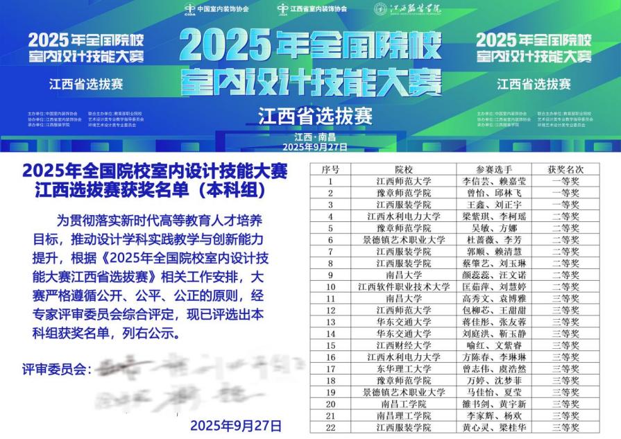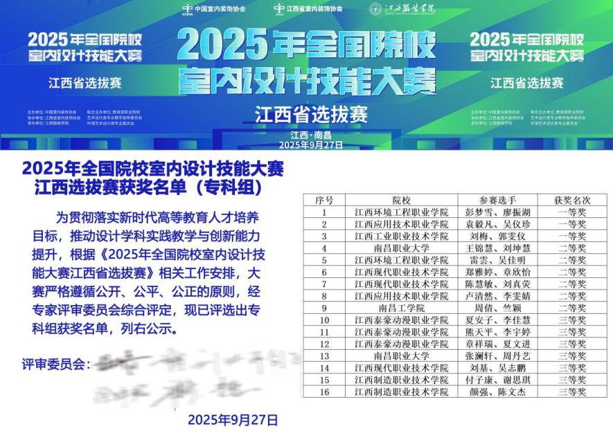 本次全国院校室内设计技能大赛江西省选拔赛,充分展示了全省院校室内设计教育的成果与活力,推动了专业建设与人才培养质量提升,强化了产教融合与知行合一的育人理念。学校将以此次大赛为契机,持续优化课程体系,拓展实践平台,培养更多兼具艺术修养、创新思维与技术能力的高素质设计人才,为江西乃至全国室内设计行业发展贡献力量。