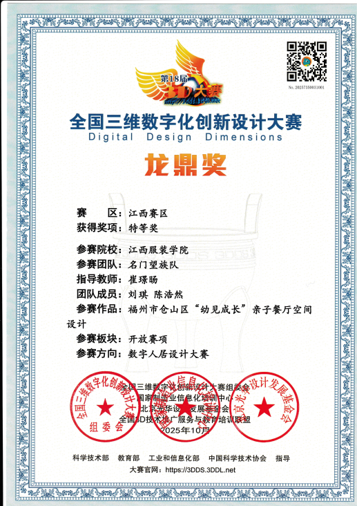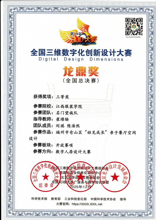 本次大赛中,名门望族队(指导教师:崔璟旸;成员:刘琪、陈浩然)以作品《福州市仓山区“幼见成长”亲子餐厅空间设计》参加“数字人居设计”方向竞赛,作品围绕亲子友好与成长体验主题,综合运用三维建模与数字化表达手段,系统呈现空间功能组织与情景化设计成果,最终获得省赛特等奖,并晋级全国总决赛斩获全国三等奖。
