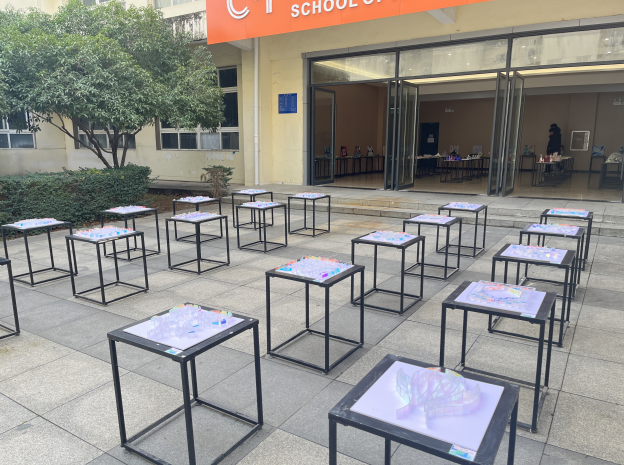 学生们以立体材料模拟城市肌理,通过视觉符号重构解构意象,聚焦有机生长、城市节奏等主题赋予哲学思考。各专业在点、线、面、体基础元素框架下,通过材质、技法、主题的差异化表达,形成了“和而不同”的艺术景观。
