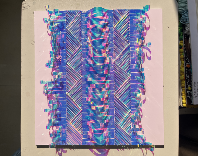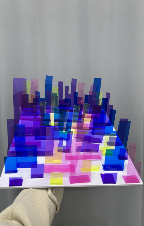 展览现场,学生作品以平面与立体、传统与现代交织的形式铺陈展开。平面纸质拼贴作品通过材质碰撞诠释解构美学,手绘创作以流动线条勾勒城市韵律,将数字技术融入静态构成实验,纤维编织工艺展现自然肌理,亚克力镭射材料通过光影层次演绎光色交响。