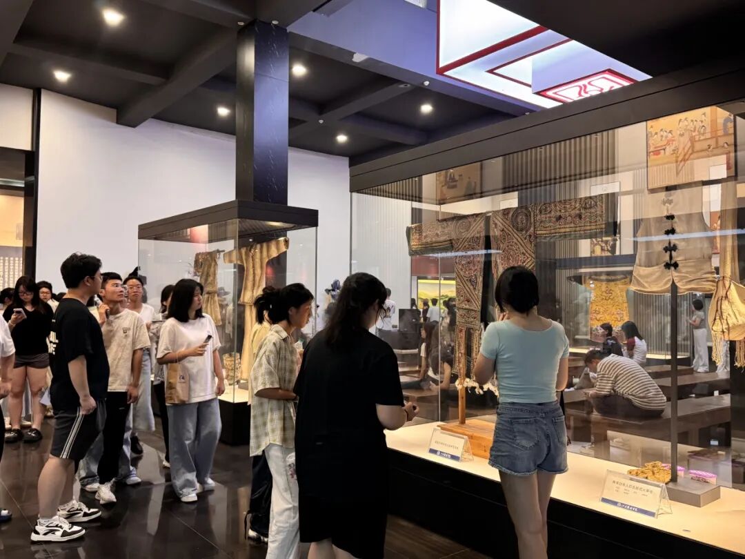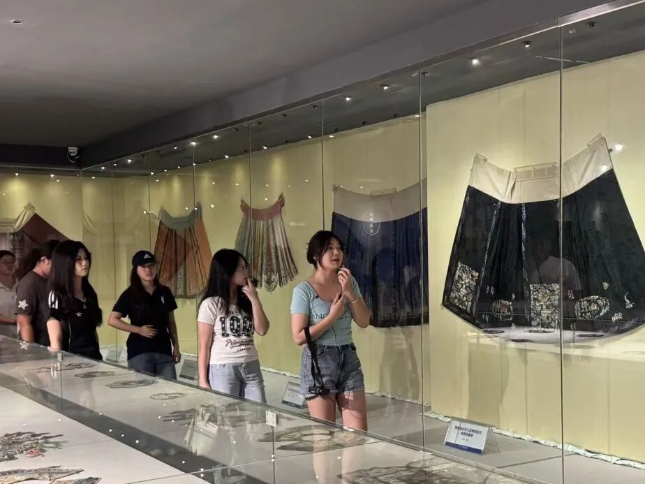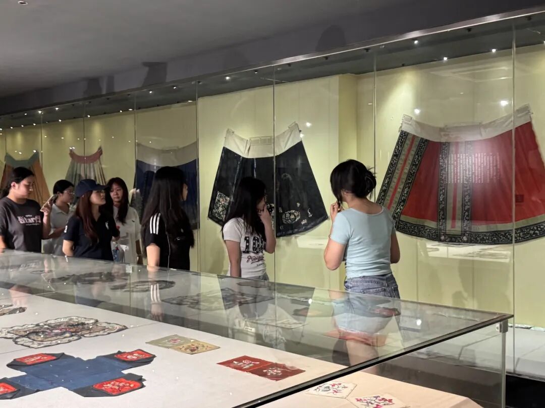 随后,讲解老师带领同学们走进近代各民族传统服饰展区。广袤中华大地孕育的五十六个民族,其服饰如朵朵奇葩绽放独特魅力,带来别样视觉震撼。讲解员围绕服饰的面料甄选与工艺技法进行系统梳理、细致解读,让同学们对我国传统民族服饰文化有了更深入全面的认知。