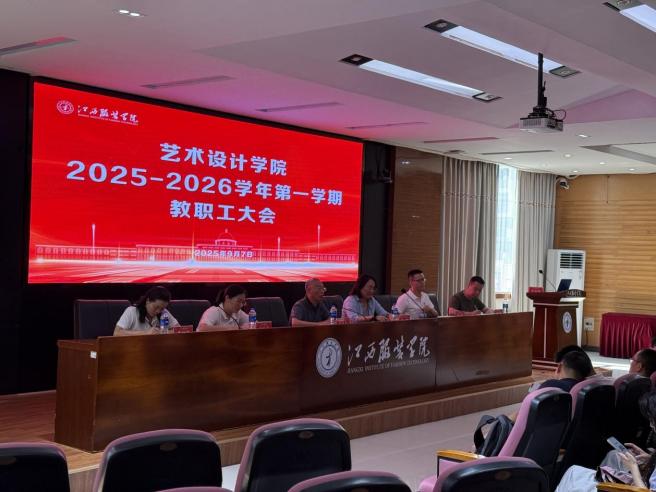 艺术设计学院讯(文:曾浩)为进一步统一思想、振奋精神,明确新学期工作方向与任务,艺术设计学院于9月7日下午2点在行政楼一楼报告厅召开2025-2026学年第一学期全体教职工大会。副校长刘孜杰亲临指导,学院领导班子成员、全体教职工参加会议,会议由学院副院长卢振邦主持。