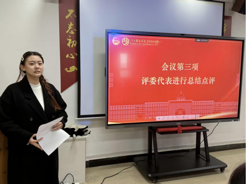 在选手们演讲结束后,艺术设计学院学生会执行主席王欣冉作为评委代表,对本次比赛作总结点评。她首先对各位选手的精心准备与现场表现给予充分肯定,尤其对能够脱稿演讲的同学予以赞扬,称赞其展现出青年学子的勇气与情怀。同时,她从演讲技巧、情感表达等专业角度,为参赛选手提出了针对性的改进建议,并鼓励现场略显紧张的同学积极参与更多演讲类活动,在实践中不断提升自我。随后,各位评委围绕演讲内容、语言表达、形象风度及综合印象等维度,对选手表现进行了严谨细致的评分。